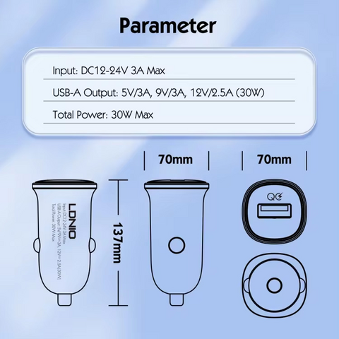 Auto punjac LDNIO C105, QC3.0, 30W USB Lightning crni