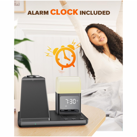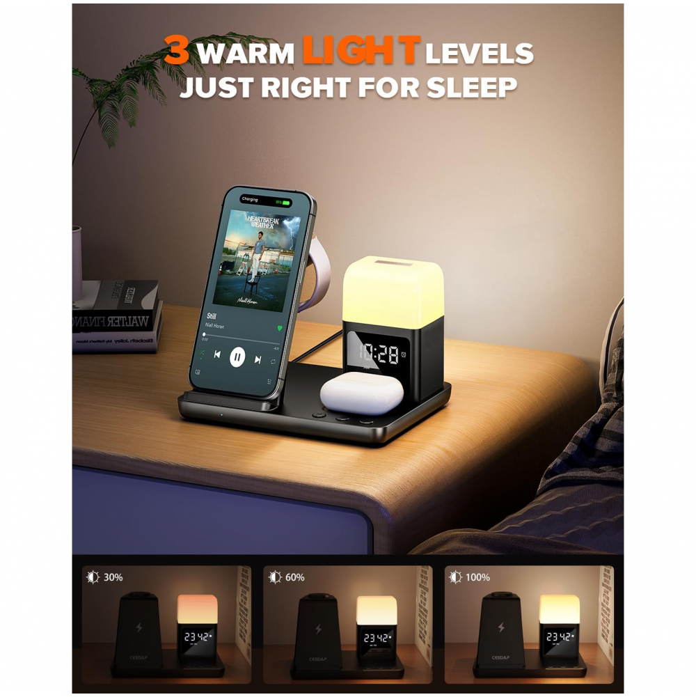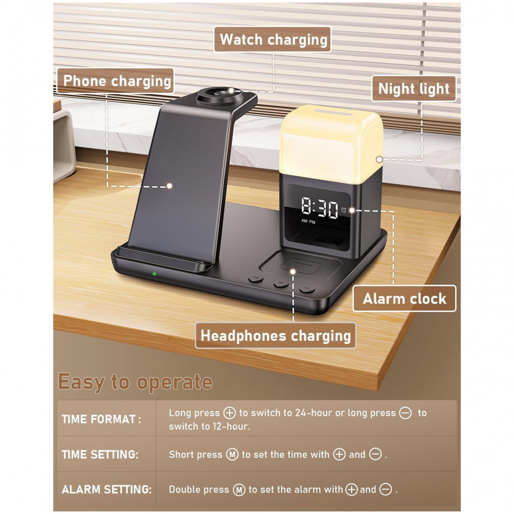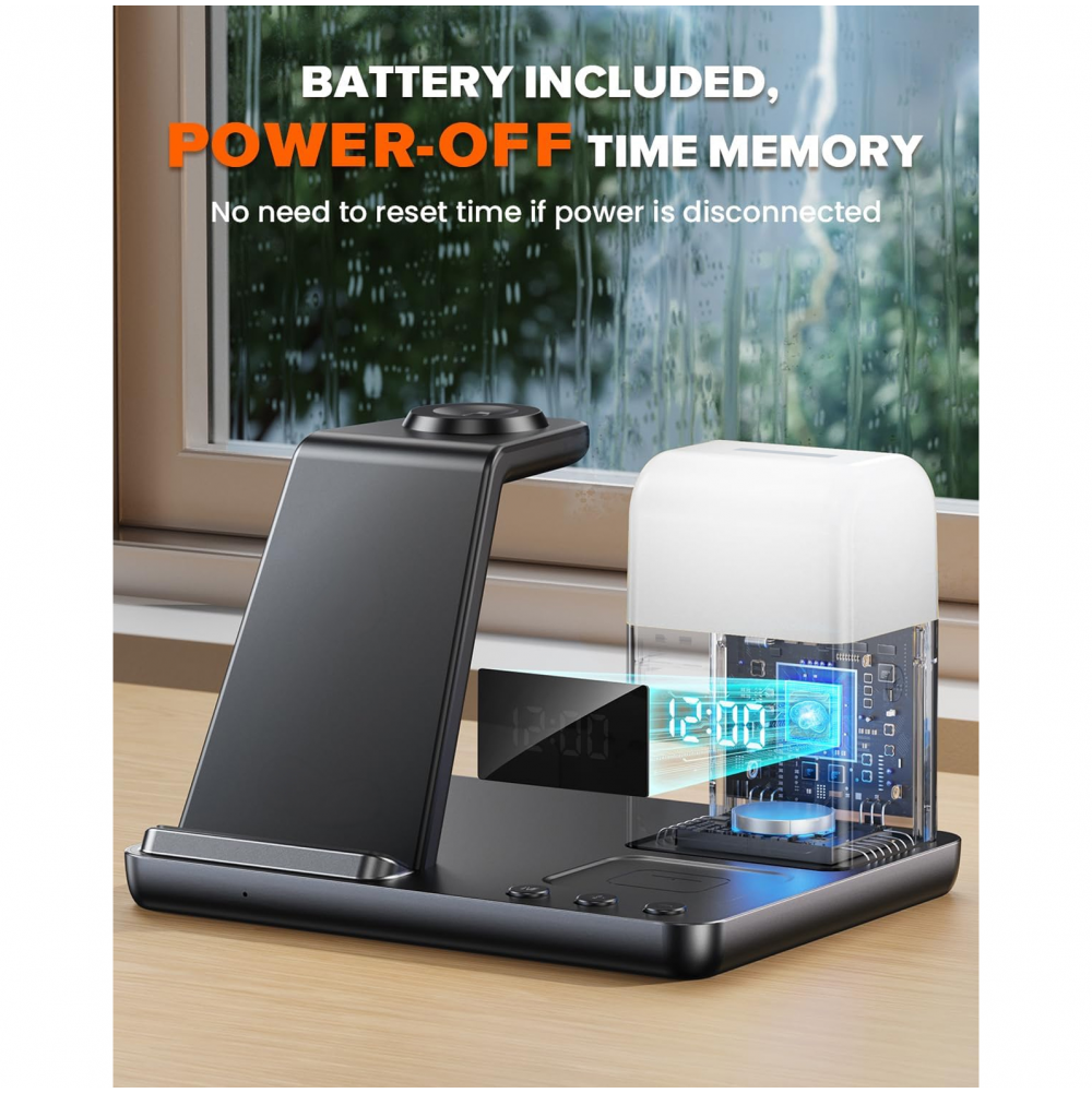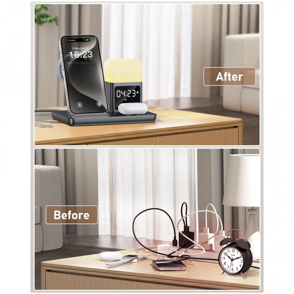 Bežična stanica za punjenje kombinuje bežični punjač, digitalni alarm sat i noćnu lampu sa tri režima osvetljenja. Omogućava istovremeno punjenje telefona, AirPods slušalica i Apple Watch sata, čime vaš radni sto ili noćni stočić ostaje uredan i bez gomile kablova.