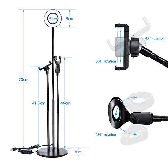 Prsten sa LED diodama po želji može svetleti intenzivno belim, žutim ili toplim žuto-belim svetlom. Savitljivi nastavci omogućavaju postavljanje telefona i mikrofona* pod idealnim uglom kako bi na jednostavan način snimili video materijal. Stabilno postolje daje mogućnost postavljanja seta na bilo koju ravnu površinu.