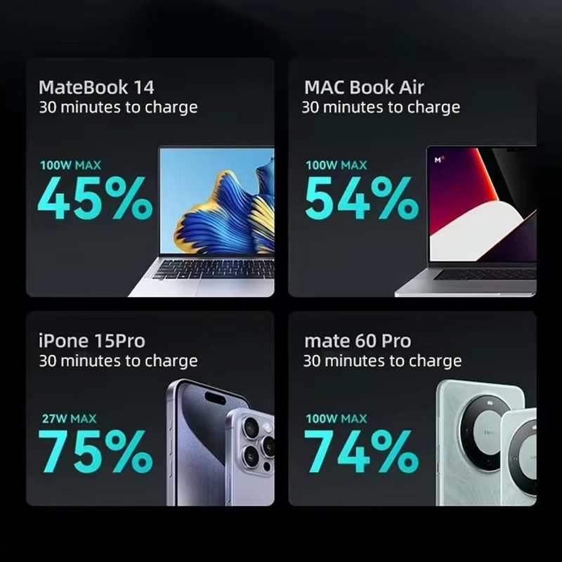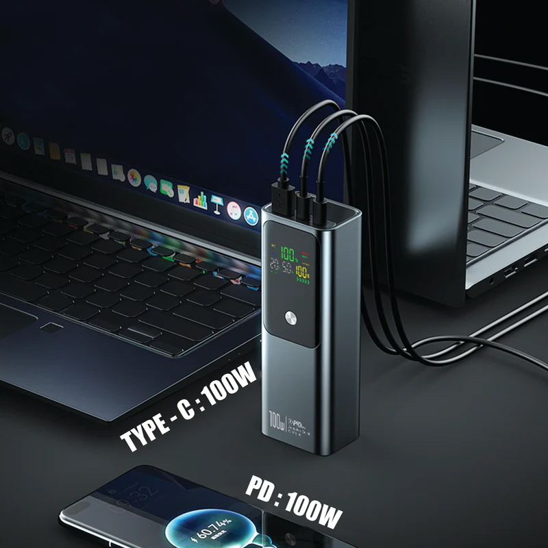 OxPower power bank podržava 100W PD i QC brzo punjenje, što omogućava do 4 puta brže punjenje u odnosu na standardne punjače. Putem 100W USB-C porta možete napuniti MacBook Air ili iPhone 15 do 50% za samo 30 minuta, štedeći vreme i uvek ostajući napajani.