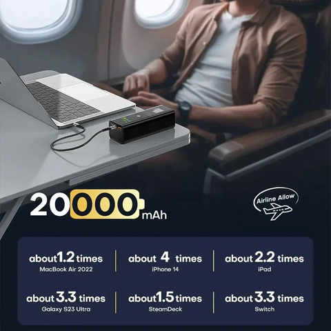 Sa snažnom baterijom od 20000 mAh, može napuniti iPhone 15 Pro do 3,5 puta, MacBook oko 0,8 puta ili Samsung Galaxy S24 Ultra do 5 puta. Savršen saputnik za duža putovanja i vikend avanture.