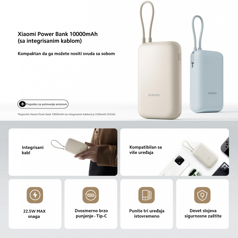 Integrisani kabl Xiaomi Power Bank 10000mAh je kompaktna i prenosiva baterija za napajanje sa integrisanim kablom, što ga čini pogodnim za svakodnevnu upotrebu u pokretu.
