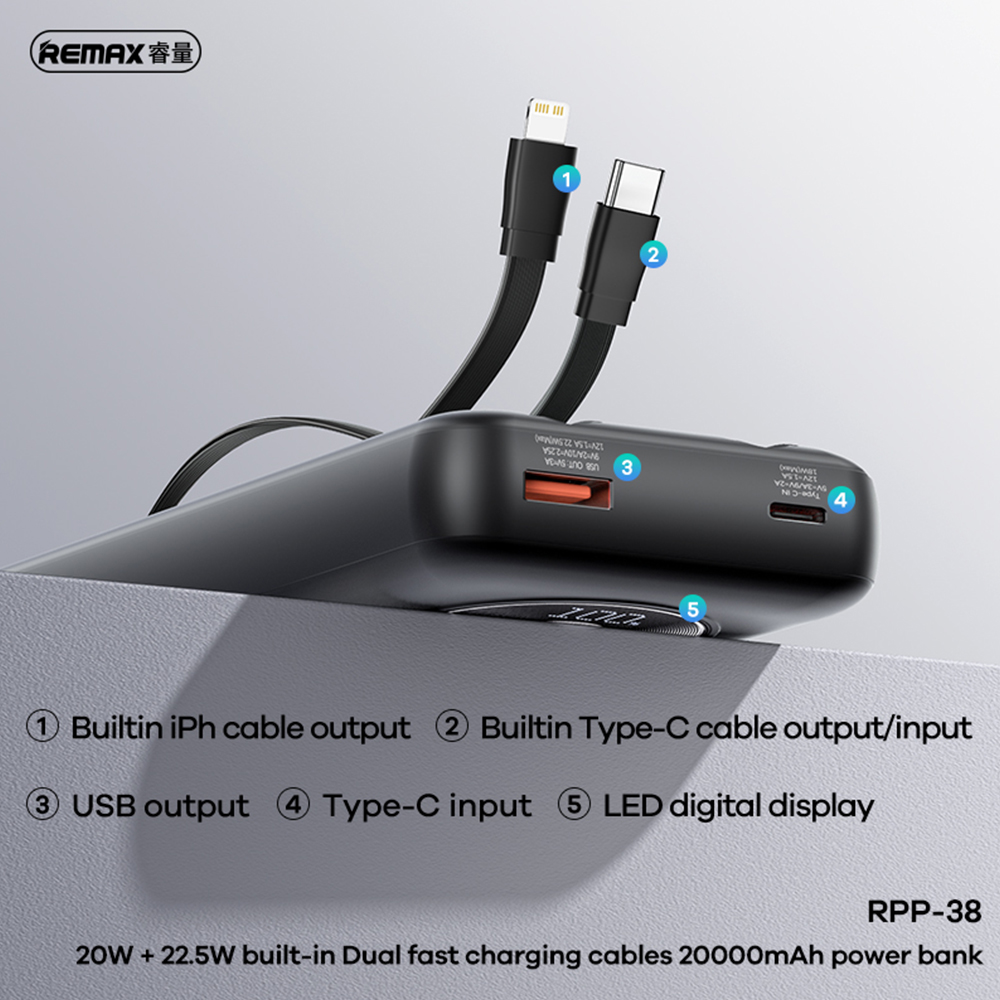 * Ugrađena 2 kabla za brzo punjenje, bez potrebe za nošenjem dodatnih kablova, Type-C kabl podržava dvosmerno brzo punjenje;