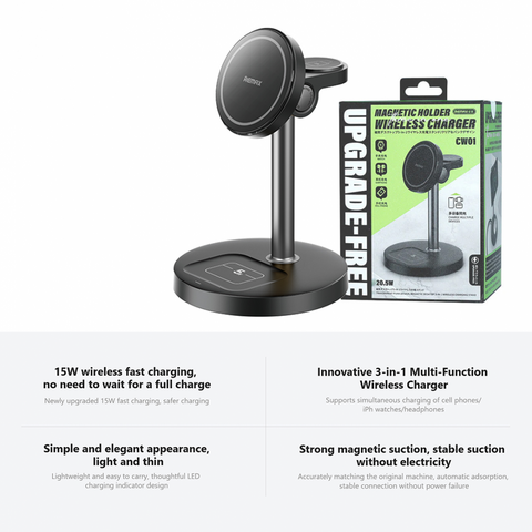 CW01 je praktičan i elegantan 3-u-1 magnetni bežični punjač koji omogućava da na jednom mestu punite telefon, bežične slušalice i pametni sat.